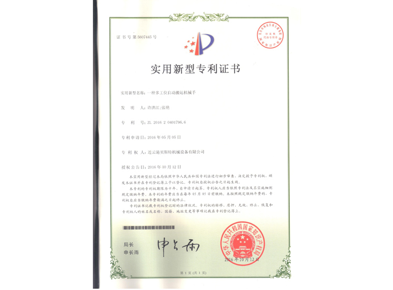 一種多工位自動(dòng)搬運(yùn)機(jī)械手專利證書